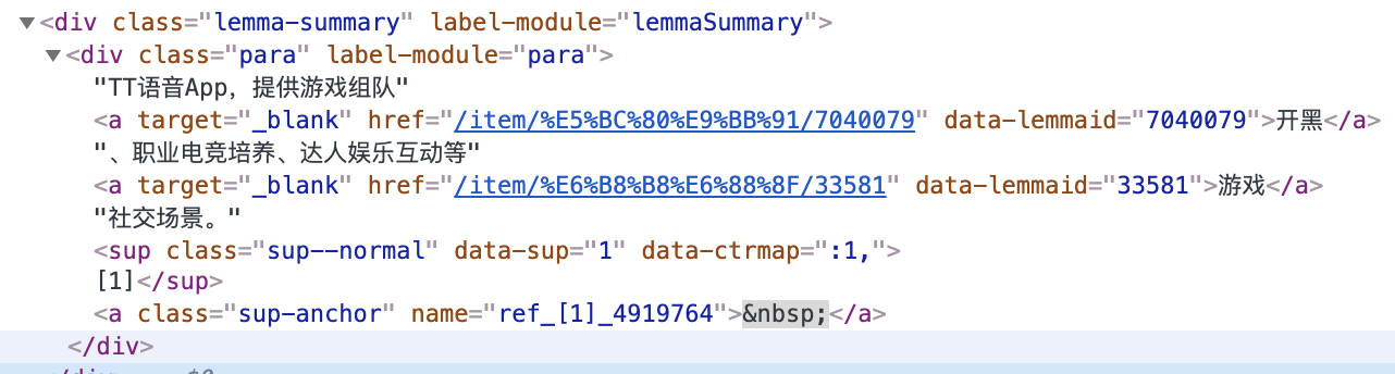 在所附的html屏幕截图中,我希望在‘引理-摘要’部分获得文本摘要。这通常是维基百科条目的第一句话。这是一个中文维基百科条目。我通过BeautifulSoup使用了这段代码