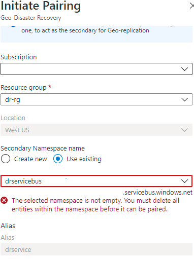 我在美国西部有一辆Azure服务总线,启用了Geo恢复功能,可以与东美国同步。我可以成功地将故障转移到美国东部的第二个地区,但是我不能从东美国到西美国。我在美国西部没有任何留言