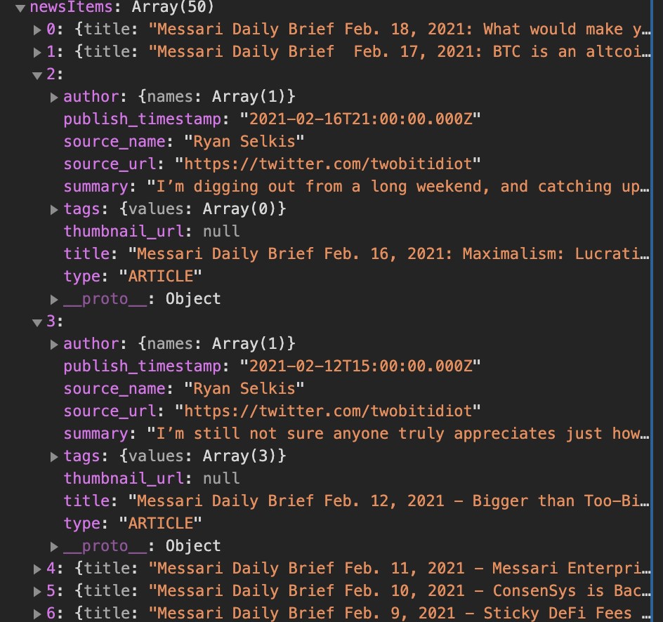 是否有办法将"Messari每日简报“从api中排除,并包含其他所有内容?我试着从标题字段抓取所有东西,但是梅萨里每日文本。