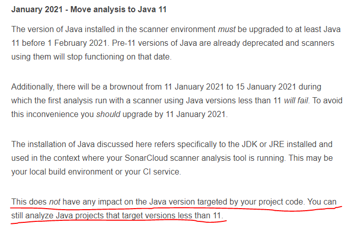 我不知道是什么问题。公告通知您必须使用Java来执行扫描,但是您仍然可以用11+ <11编译代码。您没有提供任何关于您的项目的信息,所以让我们以一个Maven项目为例。