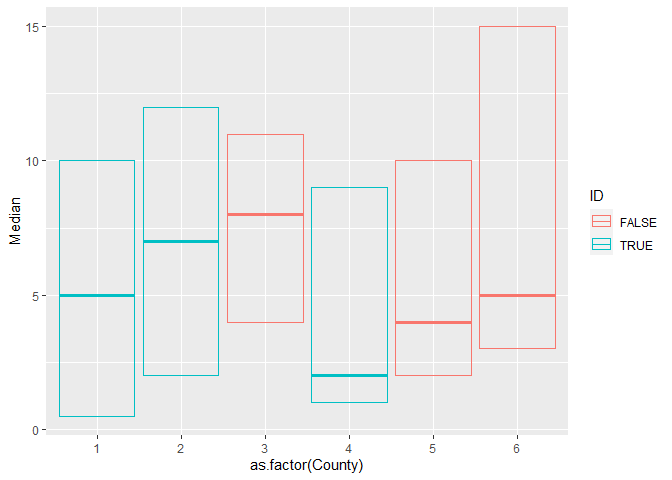 High = c(10,12,11,9,10,15), ID = c("TRUE", "TRUE", "FALSE", "TRUE", "FALSE", "FALSE")) 我想要创建一个在x轴上的县,y轴上的中、低和高的boxplot,ID (真/假)作为填充。因此,我想要六个不同的(在本例中)框图(三个为假,三个为真)。但是我不知道如何处理我的数据,因为我没有ymin和ymax。