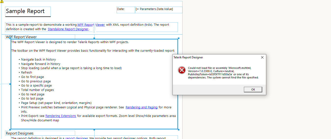 我正在使用Telrik Reporting,在打开trdp文件以修改它之后,当我选择一个区块部分来编辑它时,我得到了以下错误:
