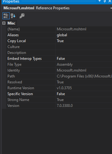 我已经在VisualStudio2019中添加了Microsoft.mshtml,Copy local选项被设置为true,但是没有任何更改,而且我仍然会得到这个异常。