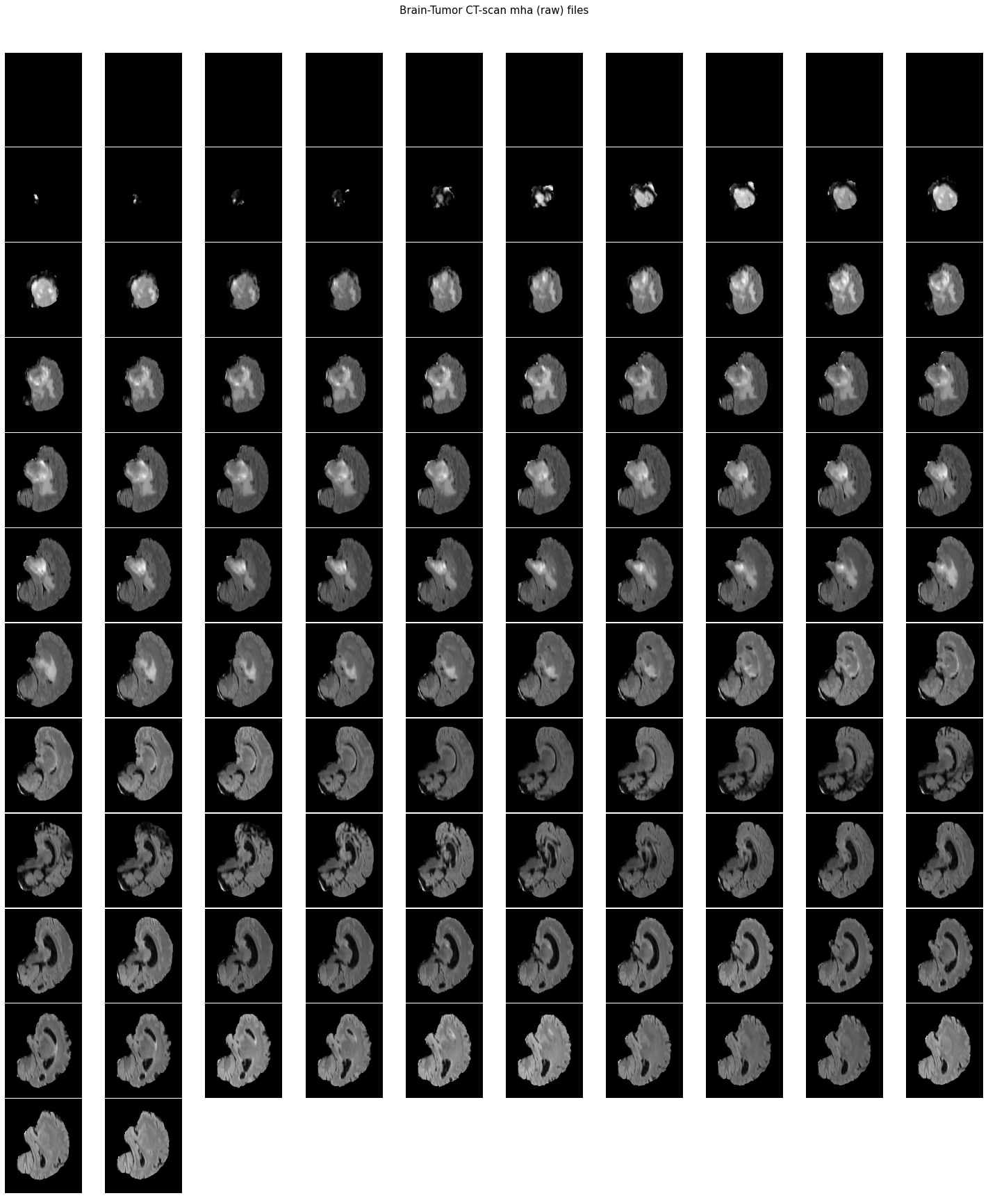 plt.suptitle('Brain-Tumor CT-scan mha (raw) files', size=15)
