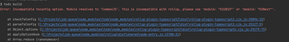 因此,每次我想通过yarn add modulename将模块添加到包中时,如果tsconfig.json文件中有compilerOptions选项:"module": "commonjs"具有以下值,tsdx build无法构建代码,并返回以下错误: