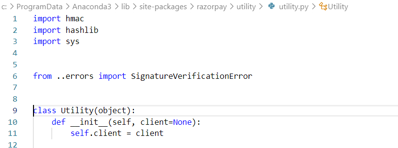 这就是如何实例化实用程序类的方法。如果您转到razorpay.Client在VSCode (F12)中的定义,您可以看到它导入了实用程序类。