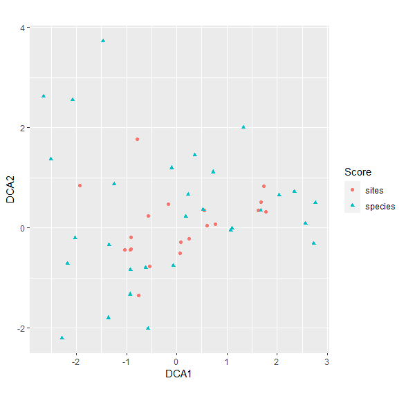ggplot_build或layer_data提取图层数据,并创建一个整体或单层(生成数据的代码),并手动创建我们的绘图(不使用老实说,我认为第二个更简单,因为我们可能需要提取更多的信息,以使我们的数据合理。通过查看ggvegan:::autoplot.decorana的源代码(简单地将其打印到控制台,去掉括号),我们可以提取下面的代码,生成与图中使用的数据相同的数据。
