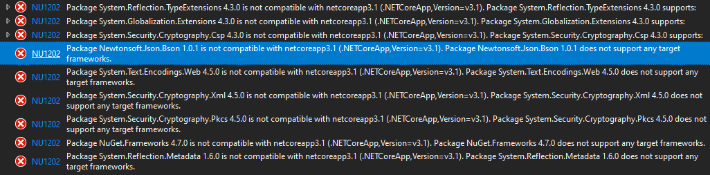 严重性代码描述项目文件行抑制状态错误NU1202包System.Diagnostics.DiagnosticSource 4.5.0与netcoreapp3.1 (.NETCoreApp,Version=v3.1)不兼容。Package System.Diagnostics.DiagnosticSource 4.5.0不支持任何目标框架。WebApi.Base C:\Users\ilyas.varol.TEST\source\repos\performancemanagementprojects\WebApi.Base\WebApi.Base.csproj