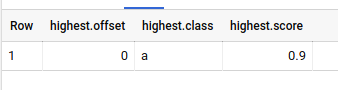 select struct(["a", "b", "c"] as classes, [0.9, 0.1, 0.0] as scores) as predicted_label