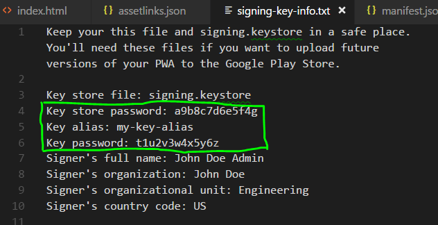 在signing-key-info.txt中,您将找到PWAbuilder的Android包选项所需的信息,以填充签名键部分输入字段:Key alias + Key password + Key store password