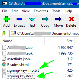 ,您将得到具有密钥文件的.zip文件,如具有随机数据的signing.keystore,以及带有密码的签名key -README.txt。