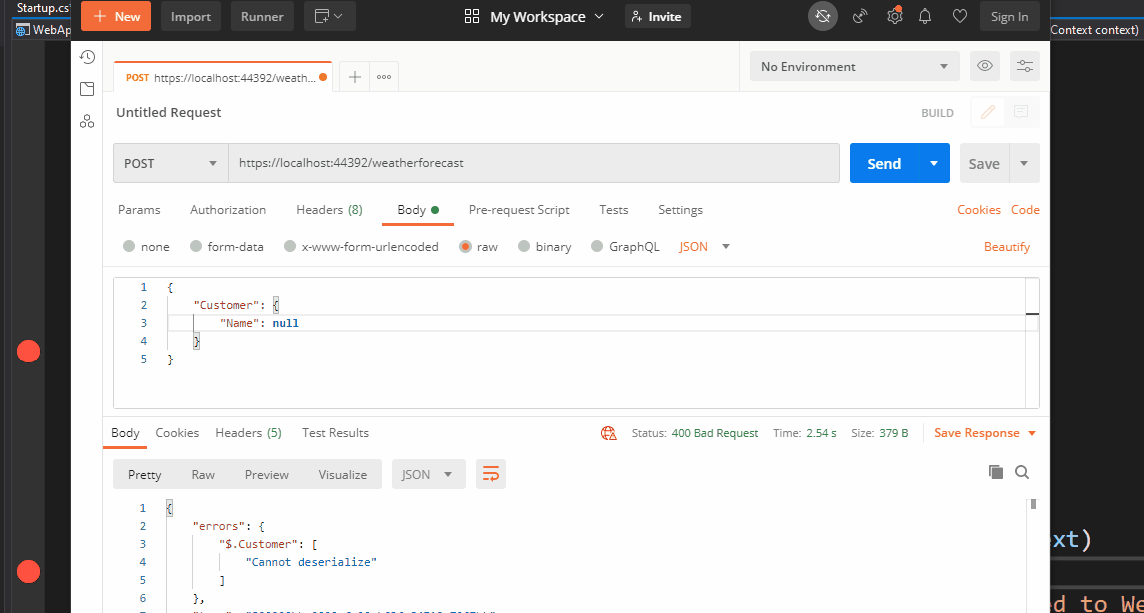 "Customer": "Error converting value 123 to type 'MyProject.Models.Customer'. Path 'Customer', line 2, position 19."