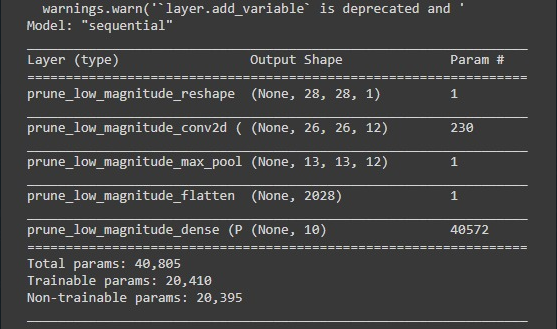 第二个模型摘要显示了为剪枝而增加的参数。它们是不可训练的参数。不可训练参数表示掩蔽.简而言之,tensorflow为网络中的每个权重添加了不可训练的掩码,以指定哪些权重应该被剪短。面具由0和1组成。