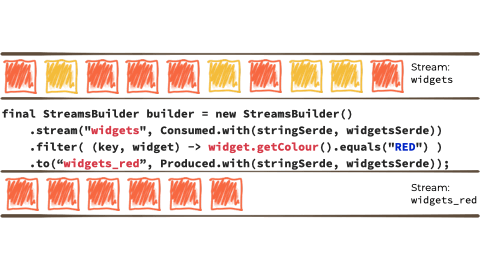 我们希望根据“小部件”的特性过滤该流,如果它是red,则将其路由到另一个流。也许我们将使用这个流来报告,或者驱动另一个只需要响应red widgets事件的应用程序: