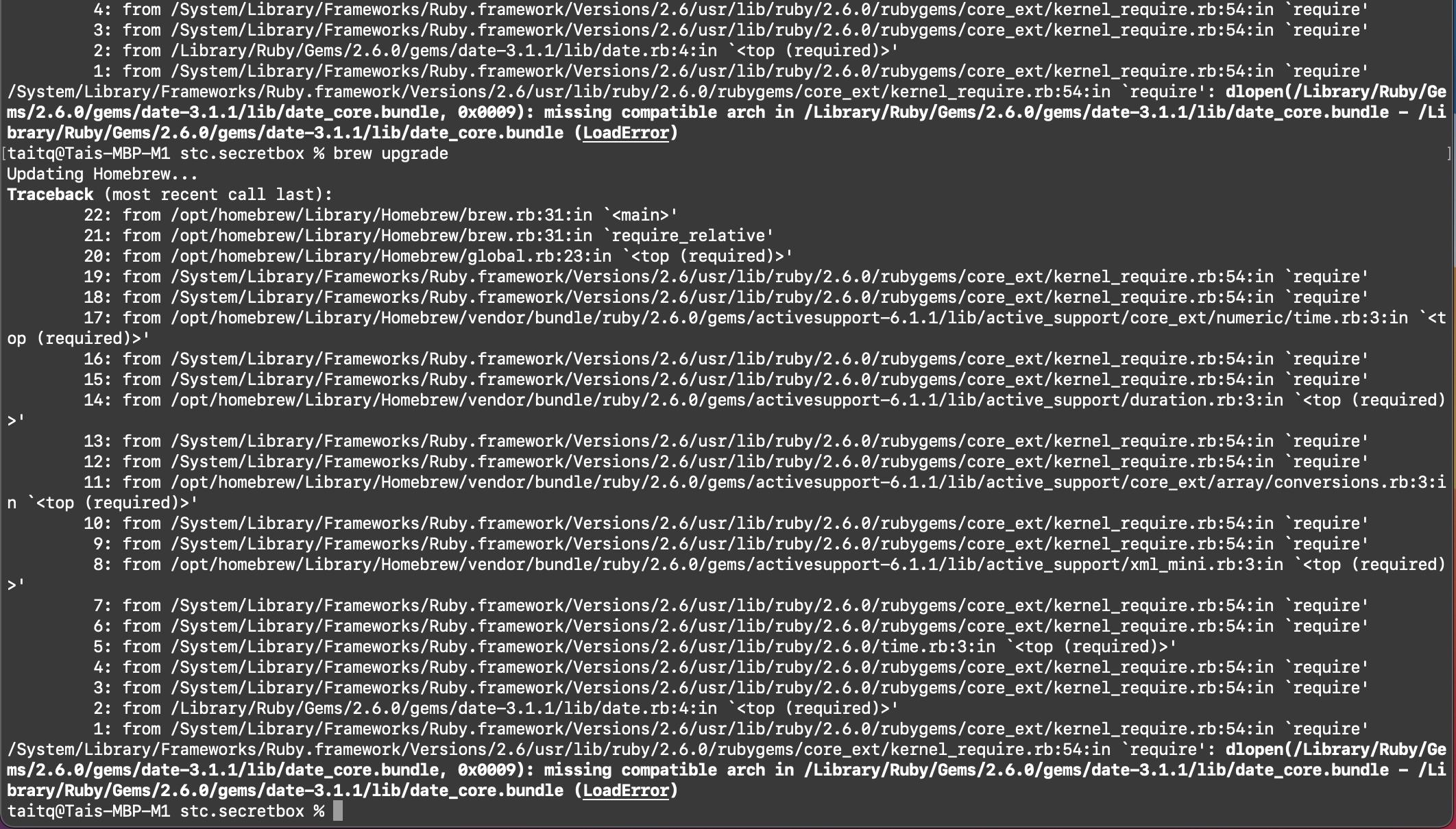 现在,当我运行任何命令,如brew xxx (brew医生,brew配置,brew升级,brew更新.)它给了我一个错误,就像附图一样。