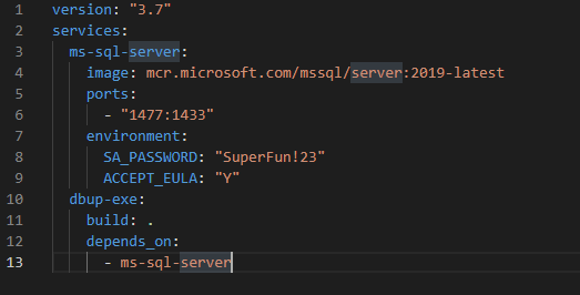 图片:mcr.microsoft.com/mssql/server:2019-最新端口:- "1477:1433“环境: SA_PASSWORD:"SuperFun!23”ACCEPT_EULA:"Y“dbup: build:.