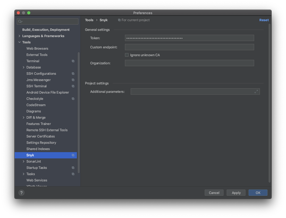 转到IntelliJ IDEA➤Preferences➤Tools➤Snyk (on macOS;对于Windows,它以FileE 222➤E 123Settings设置>e 224开始,我相信)并将令牌粘贴到令牌字段中。