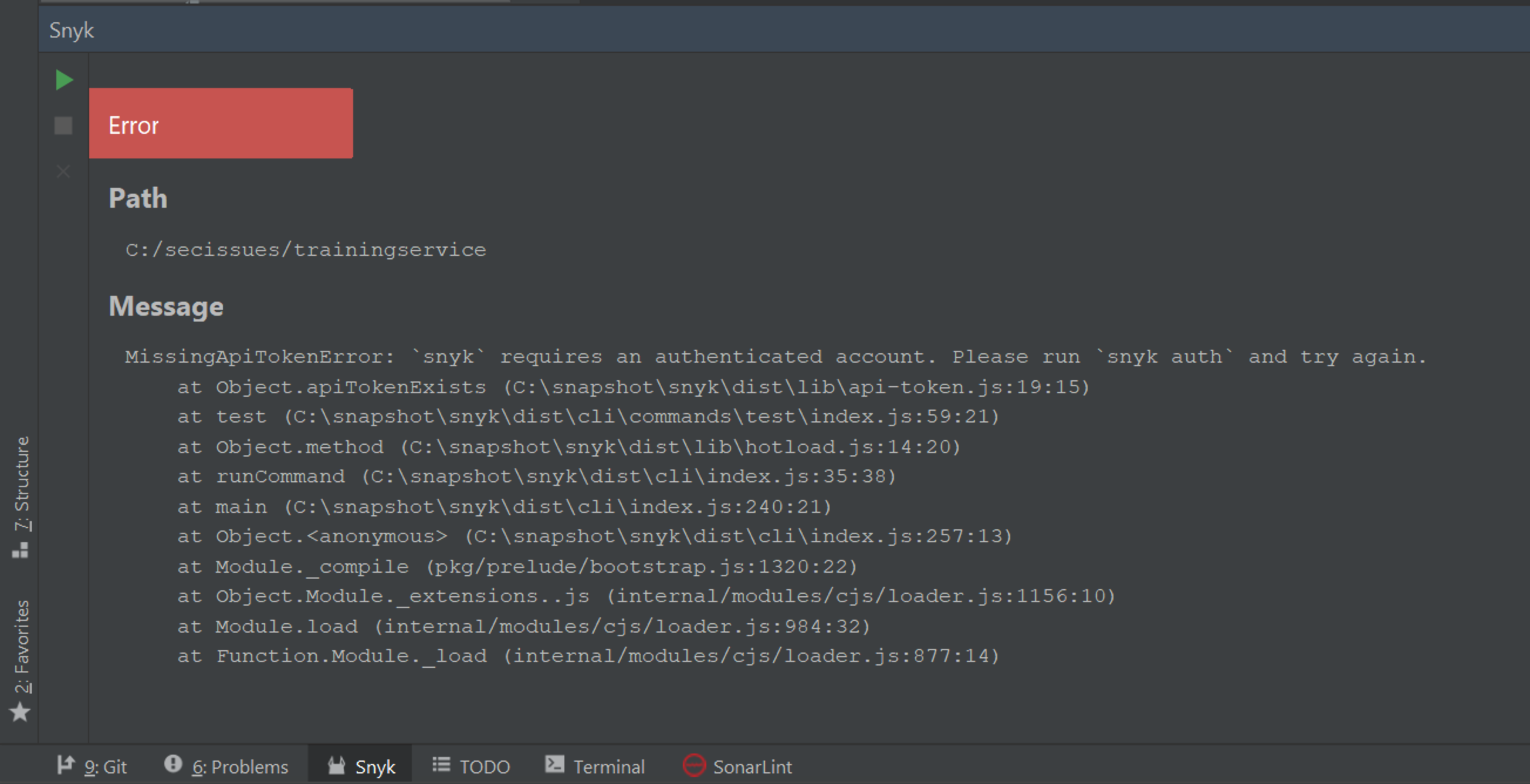 我必须说,在安装方面,并不是一个非常完善的插件;显然,他们只是希望您知道,为了能够使用插件,必须安装他们的CLI工具。JetBrains市场Snyk插件页面上没有提到这一点。