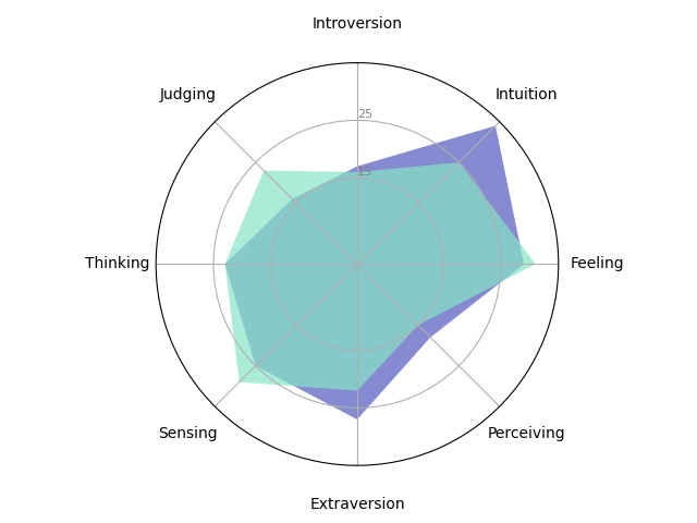 'Introversion': 16, 'Intuition': 25, 'Feeling': 31, 'Perceiving': 15,