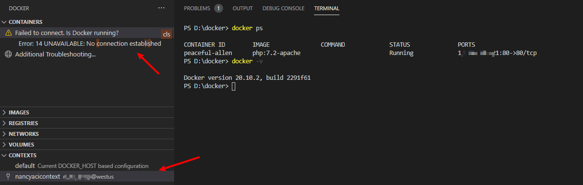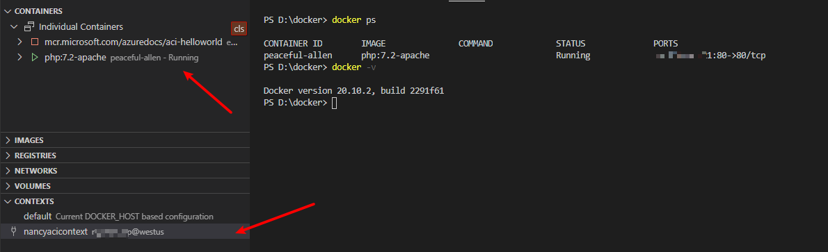 一旦对接桌面运行并刷新VS停靠扩展中的容器。ACI将显示在Docker扩展的左侧侧栏中。