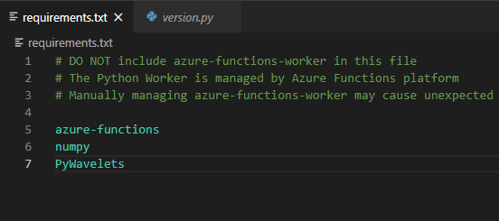 我的azure函数使用python模块pywavelets,它需要依赖于numpy。这是我的requirements.txt