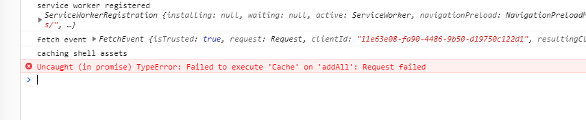 我发现了这个问题。整个设置都是正确的。问题在于我在“sw.js”文件中的“资产”中包含的urls。在url前面的正斜杠引起了这个问题。解决此问题的最佳方法是消除所有url并添加1乘1。