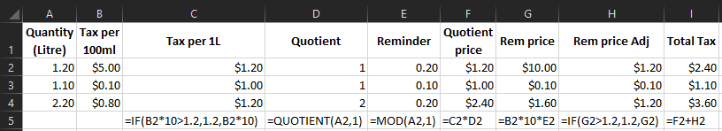 另一个例子:如果税收>1.2美元,液体容积<= 1升,那么税收是1.2美元。但是,如果液体体积大于1升和<=2升,则其馀税款为1.2 +,但不超过2.4美元。如果容量>2,但<=3,则为1.2 (对于第一升)+ 1.2 (对于第二升)+其余,但不超过3.6美元。