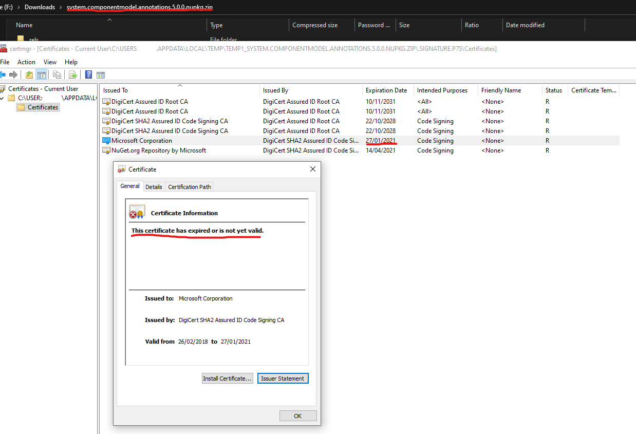 据我所知,道克在这件事上是对的。手动下载任何NuGet包,即:https://www.nuget.org/api/v2/package/System.ComponentModel.Annotations/5.0.0打开文件并查找.signature.p7s文件并使用默认程序打开它。它向我展示了微软的一份证书,它在当地时间今天下午1点就过期了。