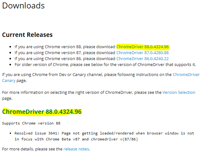 因此,我在ChromeDriver下载站点上下载了与google 88版本相对应的ChromeDriver:https://chromedriver.chromium.org/downloads。