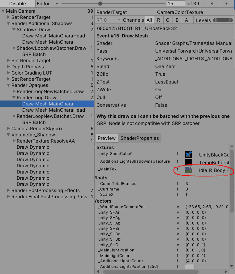 FrameDebug揭示了一些奇怪的东西。渲染管道实际上使用2种不同的纹理进行阴影和不透明渲染。在阴影渲染传递中,它使用了头部的纹理。但是在不透明的渲染通道中,它使用来自身体的纹理。