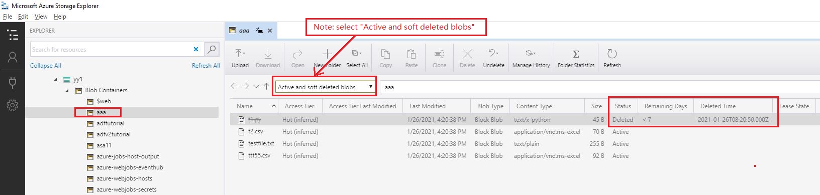 下面是一个通过UI读取此值的示例,您应该安装Azure存储资源管理器。然后,您可以看到每个已删除的blobs的RemainingRetentionDays (注意:由于这只虫子,您应该关闭版本控制功能):