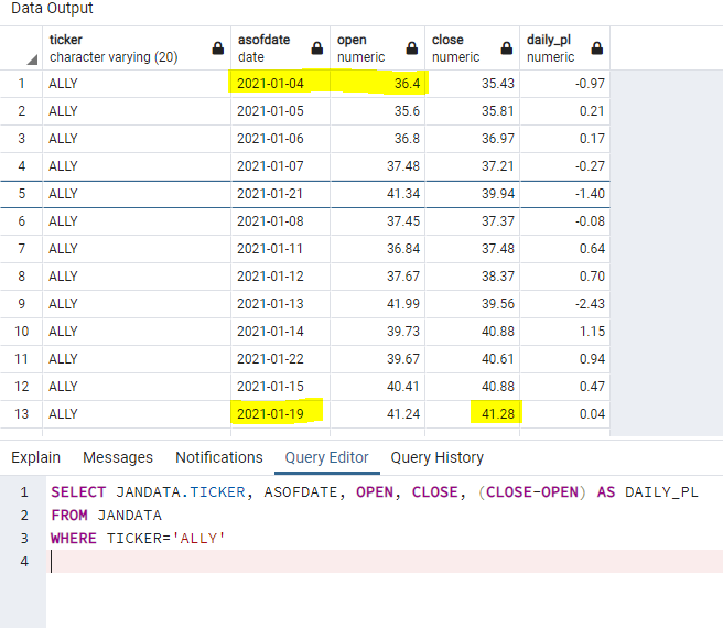 ,(close-open) AS daily_pl我无法理解使用来自第一个asofdate的asofdate和从最近的asofdate使用{close}的逻辑。桌子自然会增长,所以逻辑需要动态。见下文: