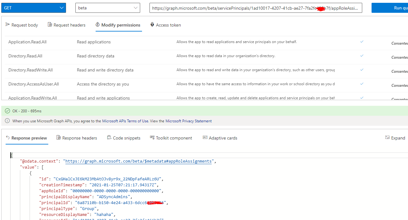 https://graph.microsoft.com/beta/servicePrincipals/{id}/appRoleAssignedTo您需要将{id}替换为Object ID