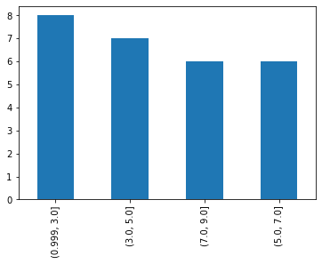 df['age_cat']=pd.cut(df['age'],bins=list(np.arange(1, 10, 2)))输出: