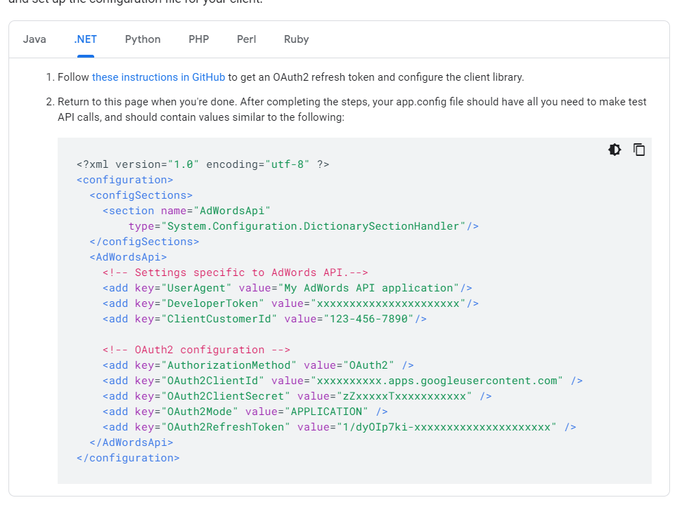 我工作的公司有很多客户使用谷歌广告为他们的网站做营销。公司希望利用客户的数据进行分析。我得到了一个项目,集成Google,使用C#从谷歌广告中获取所有数据,如广告等,并将其转移到我们的系统中。我只为客户端提供开发人员令牌和customerID。比如