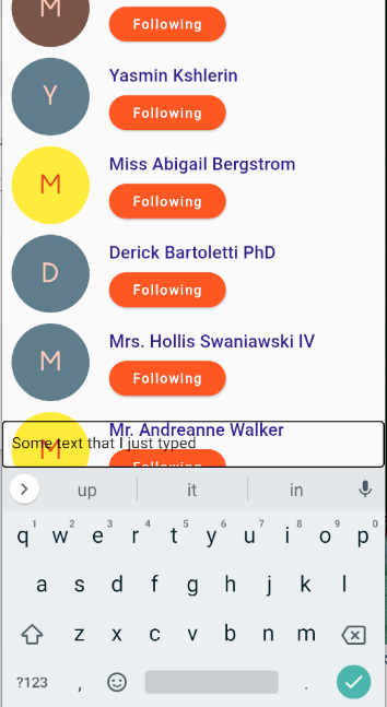 我正在与您分享一个Column的简单实现,ListView (用CustomScrollView替换它)和底部的TextField。当您单击TextField时,键盘会自动滑动到ListView上,您的所有内容都将保持可见。