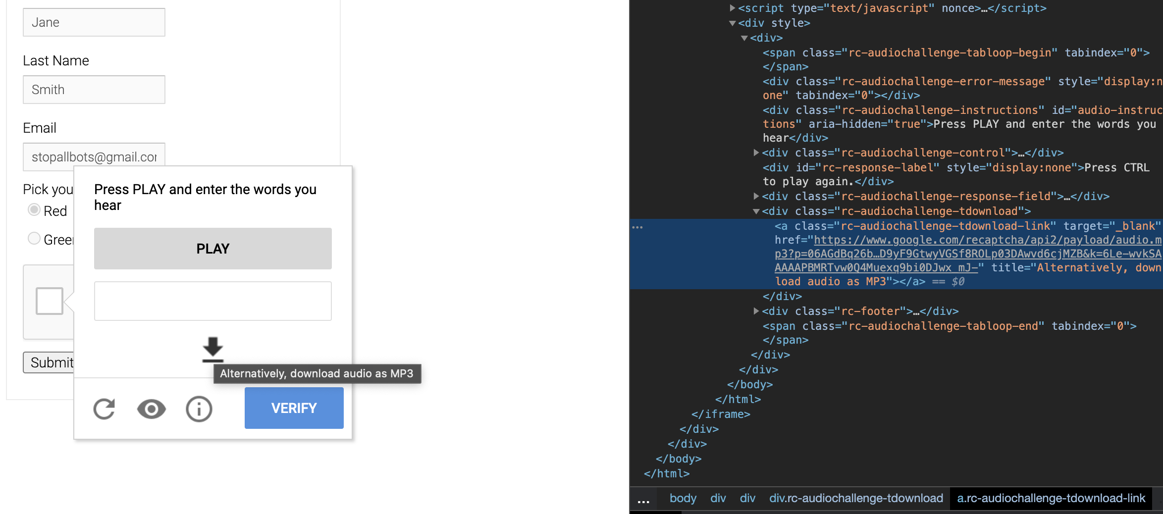 使用来自:How to interact with the reCAPTCHA audio element using Selenium and Python的代码