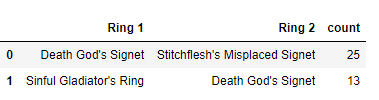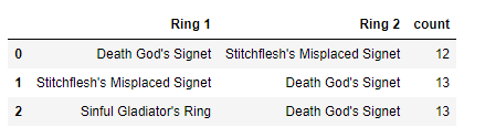 我正试图对魔兽世界的装备进行分析,我对分组有一个问题。我可以分组所有独特的头盔(头饰),并计算他们的名字。然而,在游戏中,你的角色可以戴2枚戒指.从API这个作为环1和环2,顺序不重要,但我想分组组合和计数发生。