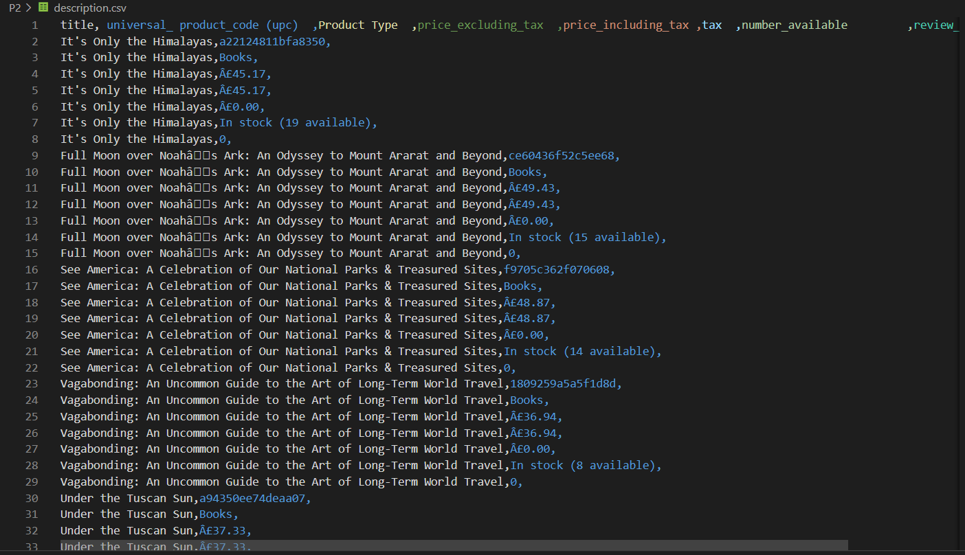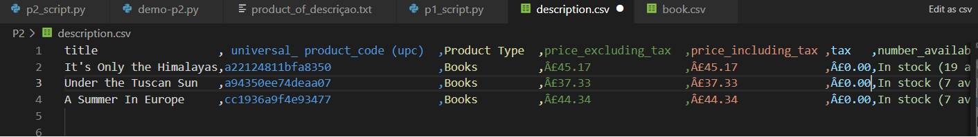 我需要刮一个图书网站,并保存信息(价格,代码,费用等)在CSV文件中作为一个表,但是当我试图将数据保存在CSV文件中时,标题名称重复了几次,并且信息是垂直的,我需要将它水平放置,在书的末尾,我需要下一个信息在底线上。