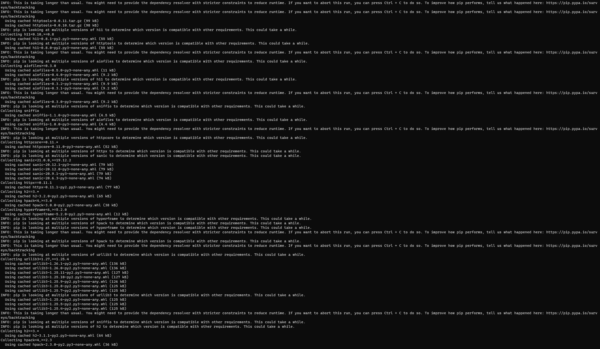 除了降级pip之外,您还可以使用旧的依赖解析器,直到pip 21.0附带(这是它们从代码库中剥离旧解析器的时候),如下所示: