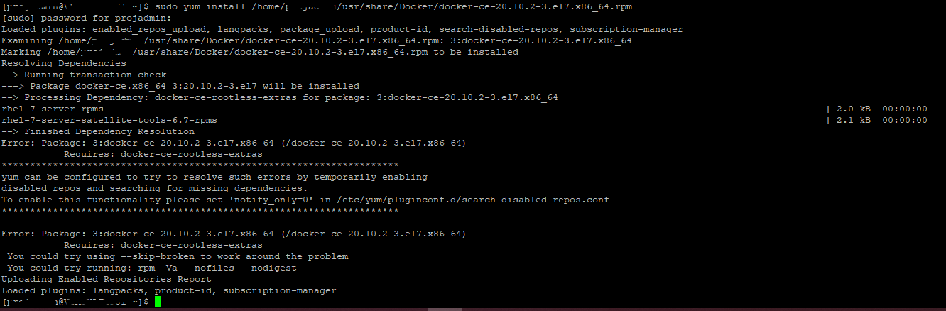 sudo yum install /home/projuser/usr/share/Docker/docker-ce-20.10.2-3.el7.x86_64.rpm错误出现了,这意味着码头-这是必需的。