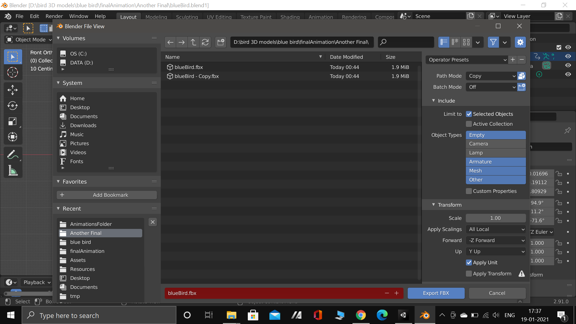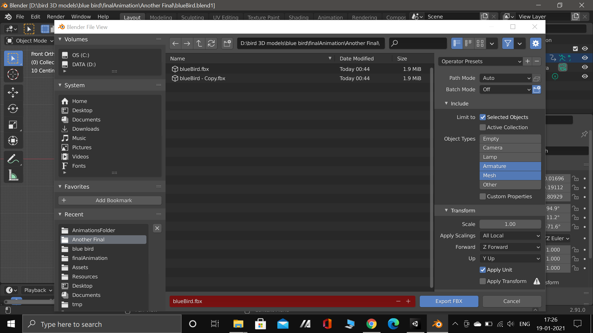 首先,我选择了鸟和鸟网。然后选择文件->导出fbx。在fbx中,我做了以下更改: