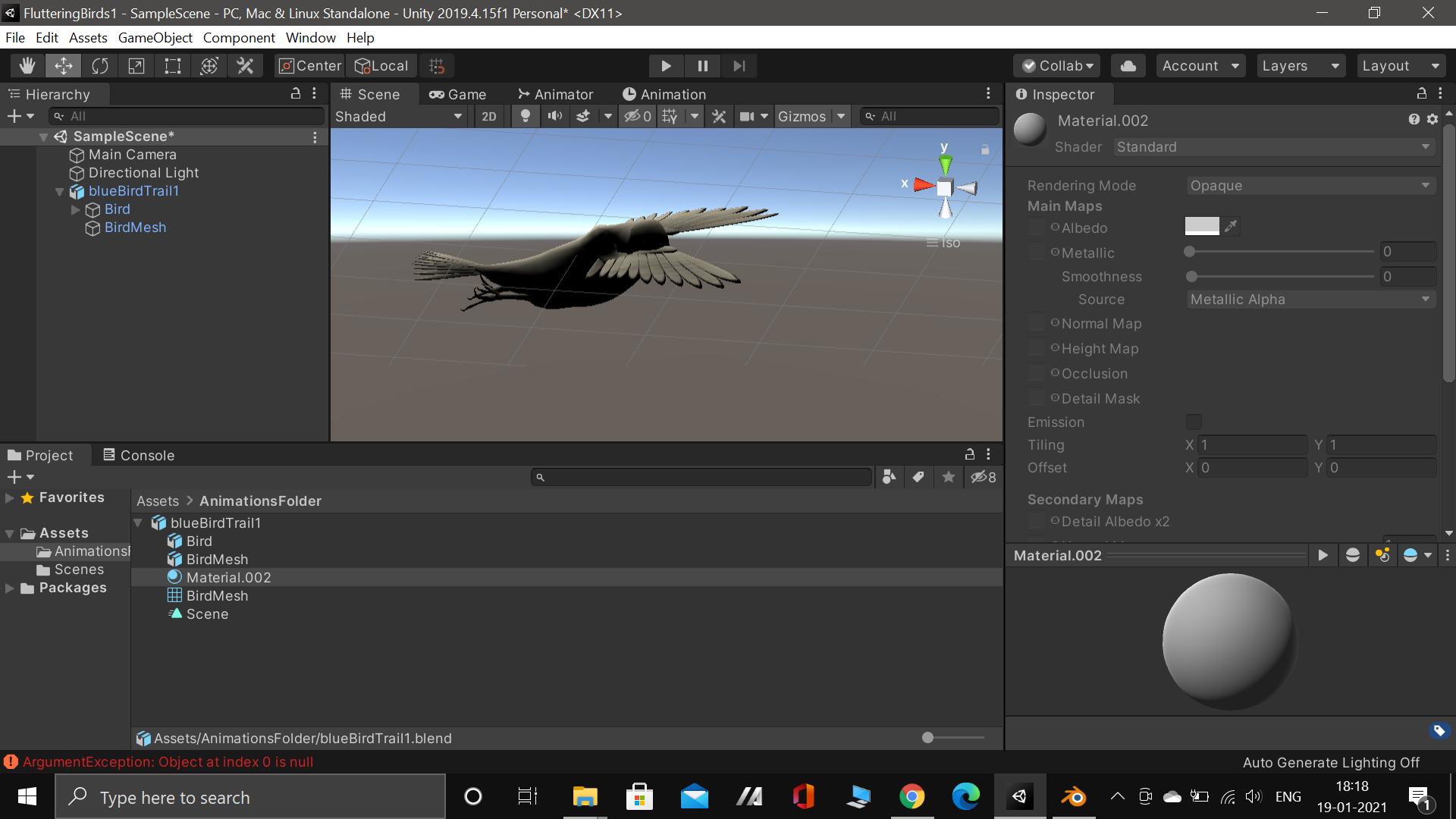 当我在fbx文件中导出时,我在3D查看器中能够看到对象和动画。但是当我导入到统一时,我看不到物体的颜色或纹理(鸟)。