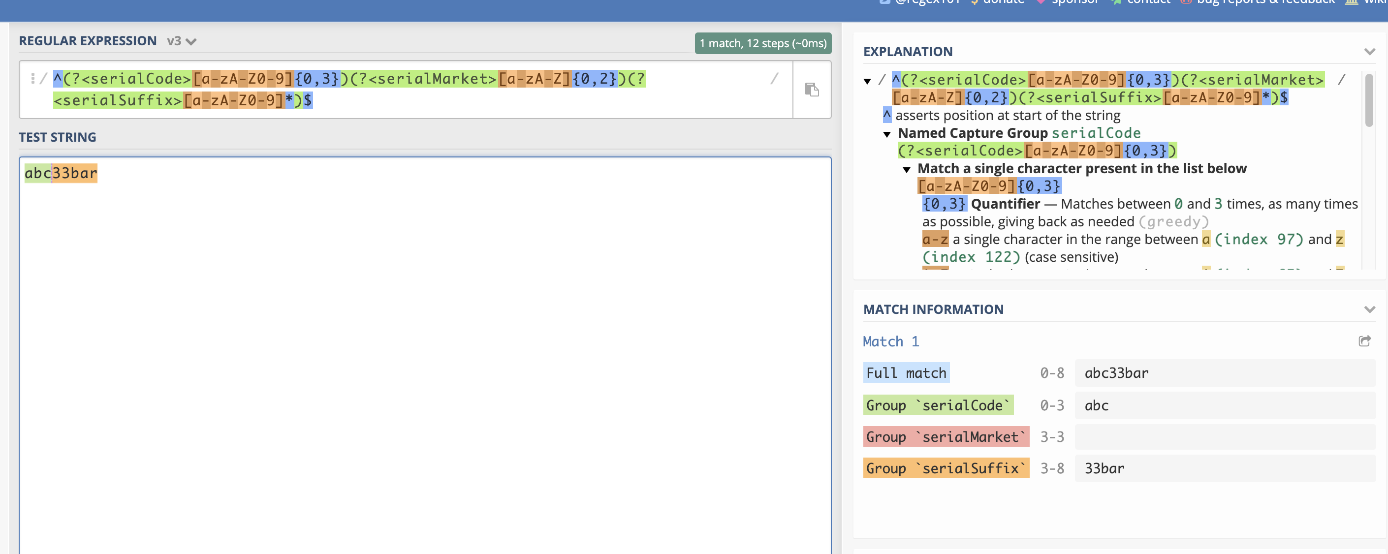 当正则表达式如:abc33bar这样的字符串失败时,它会失败,因为第四、第五个字符是数字而不是字母,这是正确的。问题是,应该匹配第二个组的字符移动到下一个匹配组(SerialSuffix),结果是: