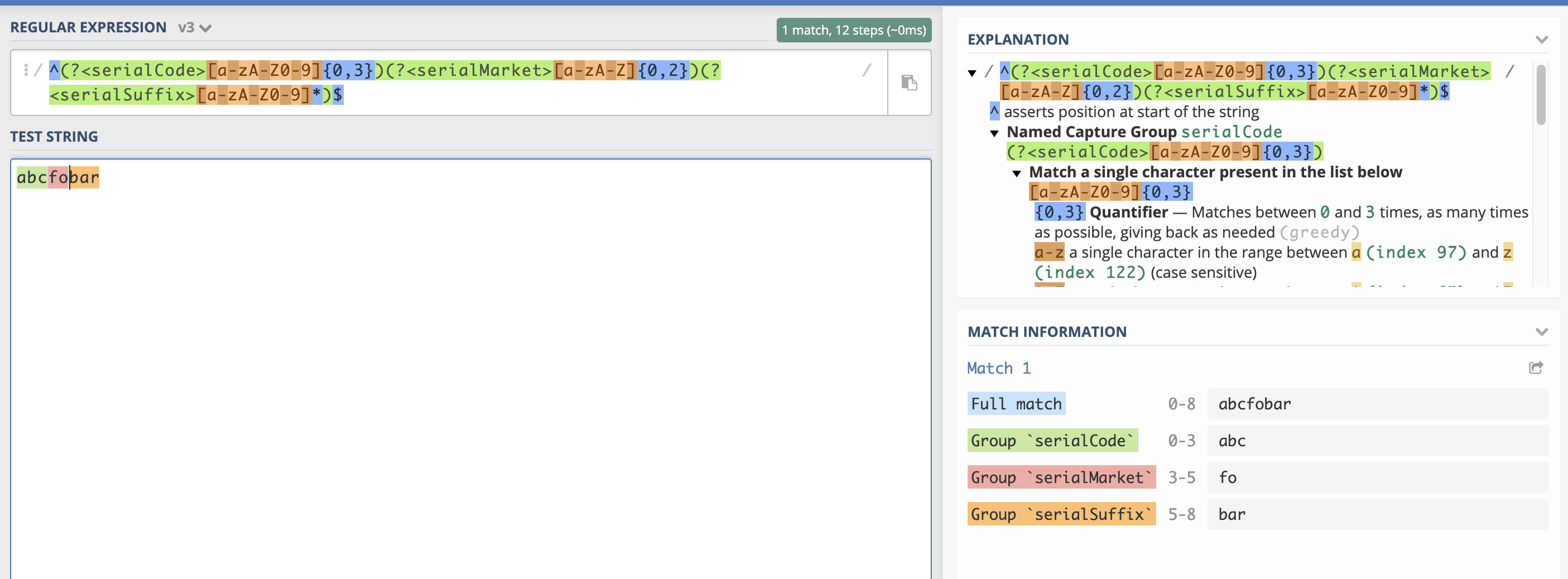 ^(?<serialCode>[a-zA-Z0-9]{3})(?:(?<serialMarket>[a-zA-Z]{1,2})(?<serialSuffix>(?<=^.{5})[a-zA-Z0-9]*)?)?RegEx详细信息: