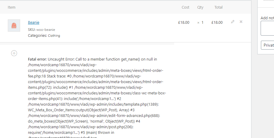 Fatal error: Uncaught Error: Call to a member function get_name() on null in /home/wordcamp16870/www/vladi/wp-content/plugins/woocommerce/includes/admin/meta-boxes/views/html-order-fee.php:18 Stack trace: #0 /home/wordcamp16870/www/vladi/wp-content/plugins/woocommerce/includes/admin/meta-boxes/views/html-order-items.php(72): include() #1 /home/wordcamp16870/www/vladi/wp-content/plugins/woocommerce/includes/admin/meta-boxes/class-wc-meta-box-order-items.php(41): include('/home/wordcamp1...') #2 /home/wordcamp16870/www/vladi/wp-admin/includes/template.php(1389): WC_Meta_Box_Order_Items::output(Object(WP_Post), Array) #3 /home/wordcamp16870/www/vladi/wp-admin/edit-form-advanced.php(688): do_meta_boxes(Object(WP_Screen), 'normal', Object(WP_Post)) #4 /home/wordcamp16870/www/vladi/wp-admin/post.php(206): require('/home/wordcamp1...') #5 {main} thrown in /home/wordcamp16870/www/vladi/wp-content/plugins/woocommerce/includes/admin/meta-boxes/views/html-order-fee.php on line 18