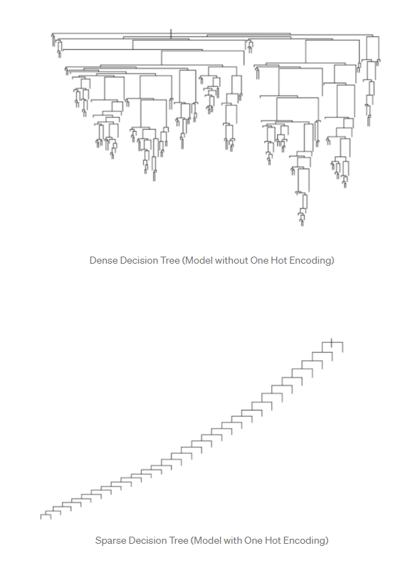 随机森林是基于决策树的原理,对一种热编码敏感的。现在,敏感的方法,例如,如果我们将一个热点诱导到一个决策树,分裂会导致稀疏的决策树。树通常倾向于一个方向生长,因为在一个范畴变量的每一个分裂中,只有两个值(0或1)。树在虚拟变量中以零的方向生长。