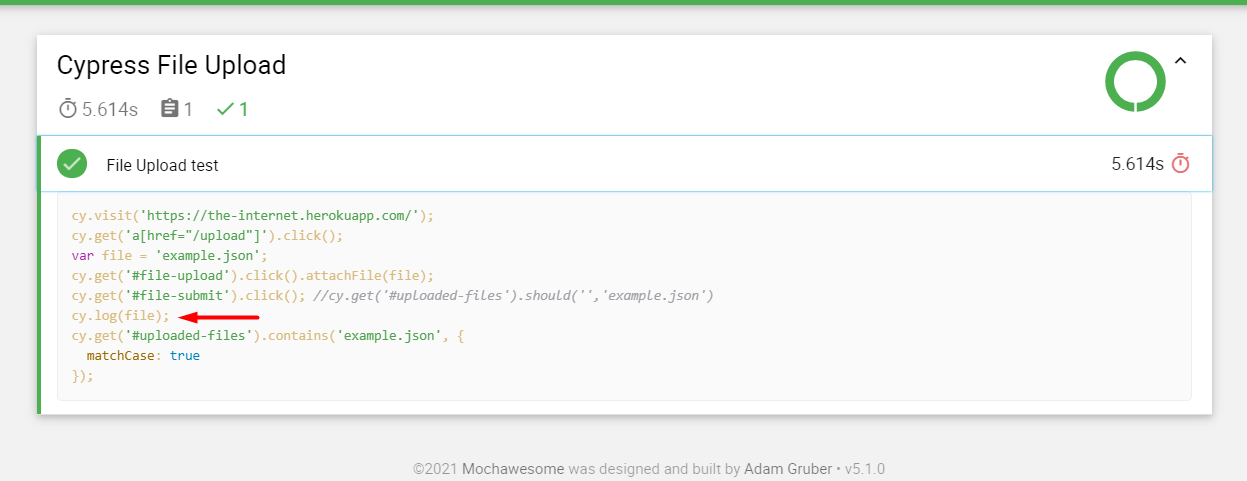 })生成的HTML显示cy.log(文件),尽管example.json是预期的