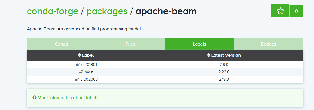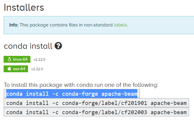 $ conda install -c conda-forge/label/cf201901 apache-beam=2.22