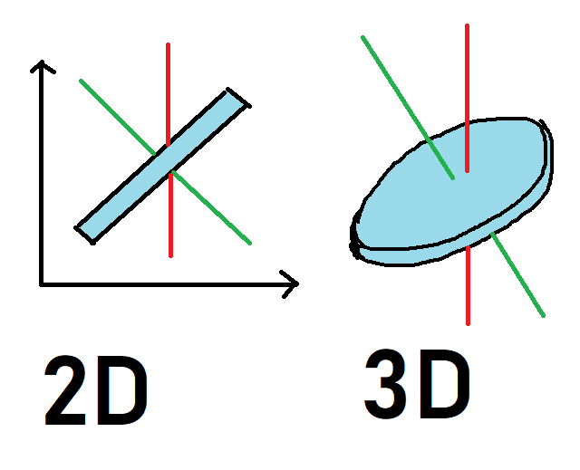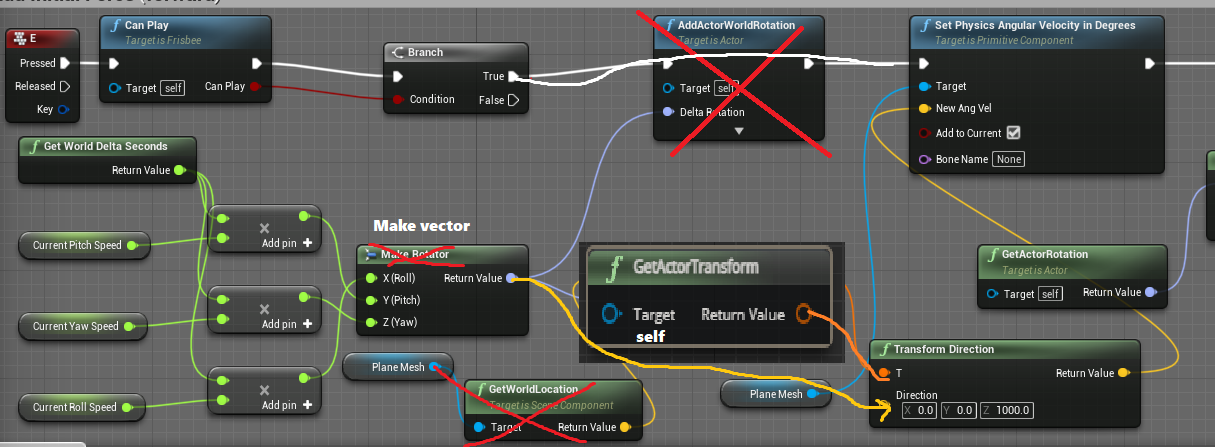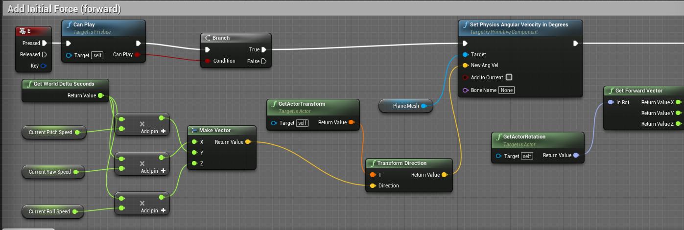 我一直试图在UE4中设定飞盘的角速度。这很简单。然而,UE4通过一个物体相对于“世界轴”的质心,而不是相对于飞盘的轴,增加了一个角速度。在“世界”轴下面是红色,相对轴是绿色,飞盘是蓝色。左边是飞盘的横向横截面,如果你要把它往前扔,然后向上倾斜,右边是同一抛球的三维表示。